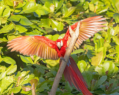 The restaurant is on a raised deck overlooking a couple of simple feeders. The main attraction is Scarlet Macaws. With the deck being raised the Macaws were at eye level in the trees. These enormous red parrots were endangered at one point by trapping for the pet trade, but with protection are now doing well.