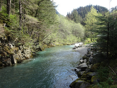 After a short check-in we were told to be back at 5:00, which left us about 7 hours to kill! We got a Juneau city map and walked to a small city park (Cope Park) where we enjoyed the beautiful sunny weather and the rushing stream. We walked by the Governor's Mansion on the way to the park.